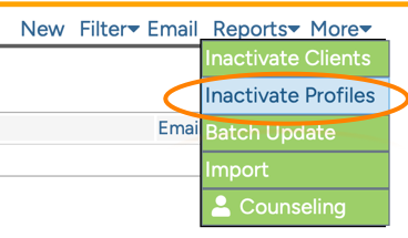 Depending upon your filter results, you may choose to inactivate the bid match search profiles associated with these clients. To do so, you will need to be in administrator-mode and with the client filter results on the screen select More|Inactivate Profiles:
