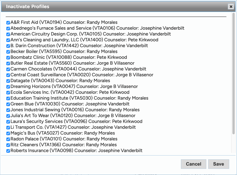 You will be presented with a list of clients whose search profiles will be inactivated all at once. You can uncheck individual clients if you don't want their profile to be inactivated: