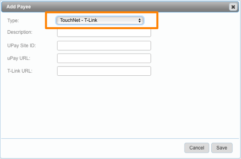 - At the "Add Payee" screen, select "TouchNet T-Link" from the Type field: