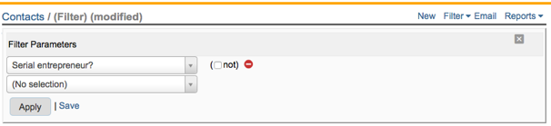 You may have more or less "Filters" options depending upon whether you have any saved or recently executed filters. Let's demonstrate this with an example. You may create a contact filter to find all serial entrepreneurs in your center by creating the following contact filter: