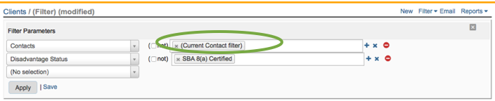 Now you may want to know how many of these businesses are SBA 8(a) certified. What you can do is bring the CONTACT filter results over and then add your additional CLIENT filter parameters, as follows: