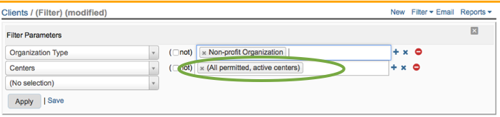 | Center v. Centers | The "Filters" option is frequently used when searching across multiple centers. There are two filters you can use to search across multiple centers. You can either use the "Center" filter or the "Centers" filter. Selecting "Center" as a filter parameter, you have the option to pick and choose the centers that you want to include in your filter: