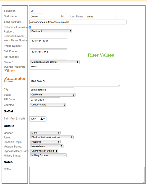 You can filter on any field that you see on the data entry record. Any field shown in light gray on the data entry screen of a Neoserra contact record, becomes a potential filter parameter: