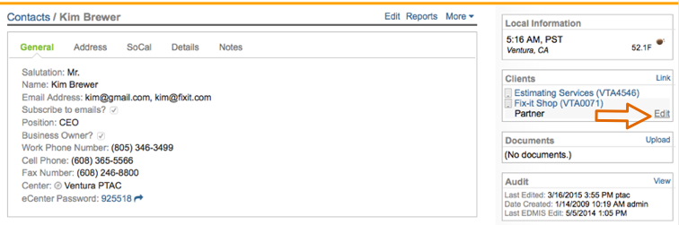 The client linkage page can be accessed by clicking on the "Edit" link next to each company that the contact is linked to: