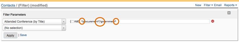 The above screenshot will search for all events with either the word "procurement" in the title of the word "government" in the title. The two wild carded words are separated by a comma. The contacts must have attended the event, all other statuses are ignored. |
