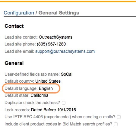 Your Neoserra database has been configured with a default language. This language choice is made by the Neoserra administrator under the Administration|Configuration|General menu option: