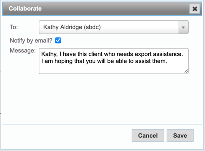 You can collaborate with any other user within your Neoserra database about a particular client. You might want to use this feature, for example, if one counselor is assigned to work with a client but the counselor feels that the client may benefit from another counselor's expertise, or when another department may be better suited to answer a client's questions. The counselor wanting to collaborate can click the More|Collaborate option to send a message to the second counselor requesting assistance with a client: