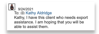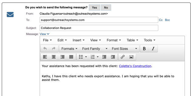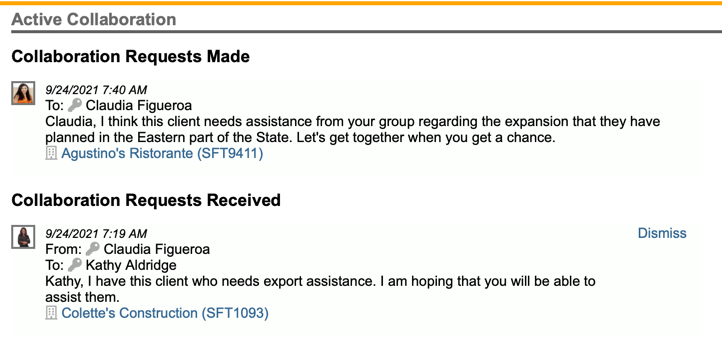 Furthermore. the two collaborators (the person sending the collaboration request, and the person receiving the collaboration request) will also see a copy of the message on the client record itself: