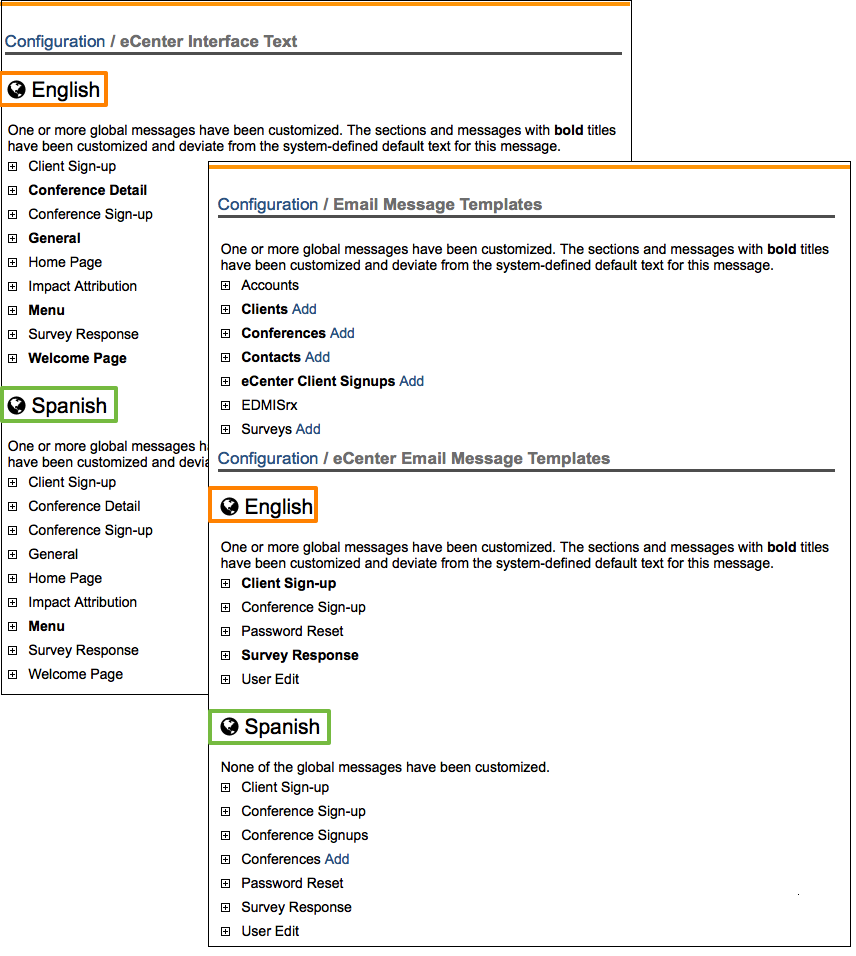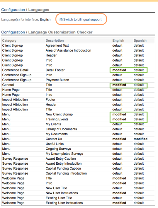 As highlighted in orange above, you can toggle between your primary language only or bi-lingual support. Below the language toggle you will see the "Language Customization Checker". This interface lets you know if there is a section on eCenter Direct that you have customized in one language but have not customized in the other language. The assumption being, that if you allow for a bi-lingual experience on eCenter Direct, then you will want to make sure that the same information is conveyed to your users in both languages. As hightlighted in green, you will see some sections on eCenter that have been customized in English, but not in Spanish.