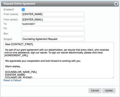 Neoserra offers a specific email template titled: "Request Online Agreement" which can be used to send to clients to request an electronic signature to your terms and conditions: