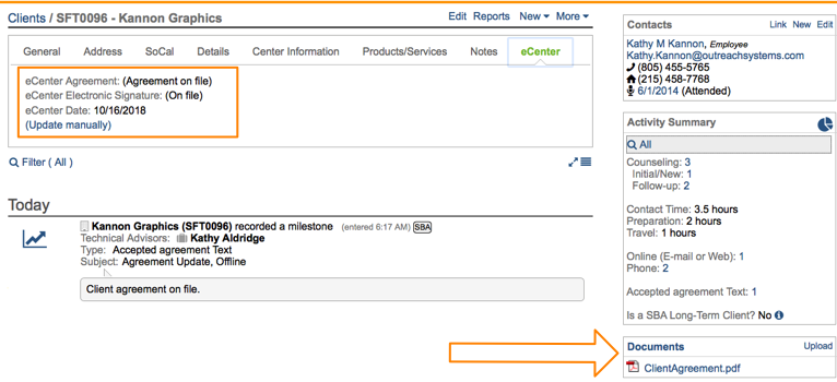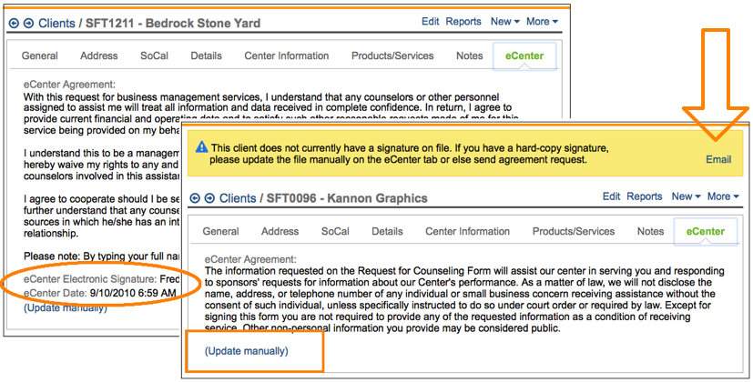 You can either send this email as needed from the Neoserra email system, or SBA-funded programs can also invoke this email from the yellow warning bar that will be displayed at the top of a client record when no eCenter Signature Date has been recorded. In the image below you will see two different clients: