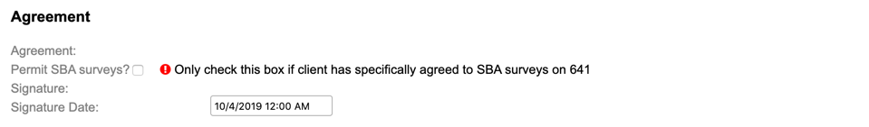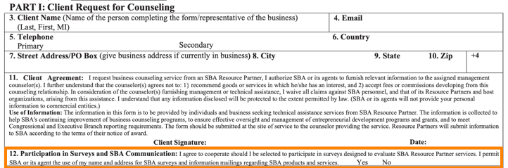 Question #12 on the SBA 641 form asks the client to indicate whether they wish to participate in SBA Surveys: