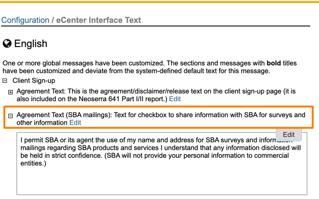 In today's day and age, we try to obtain as much electronically as possible, however, some clients may send you a hard copy of the client agreement. If you have received a paper (i.e. non-electronic) acknowledgement from the client, indicating that they agree to your latest terms and conditions and they agree to have their name be shared with SBA, then you can edit their client record and scroll to the bottom to update their eCenter Date and the Permit SBA Surveys checkbox, manually: