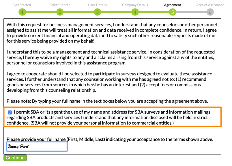 Keep in mind, clients do not need to agree to share their personal contact details with SBA. They should be made aware that they can sign up for services without sharing their identifiable information with SBA. It is important that you ONLY check this box, if the client has provided their specific consent.