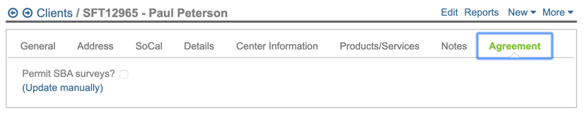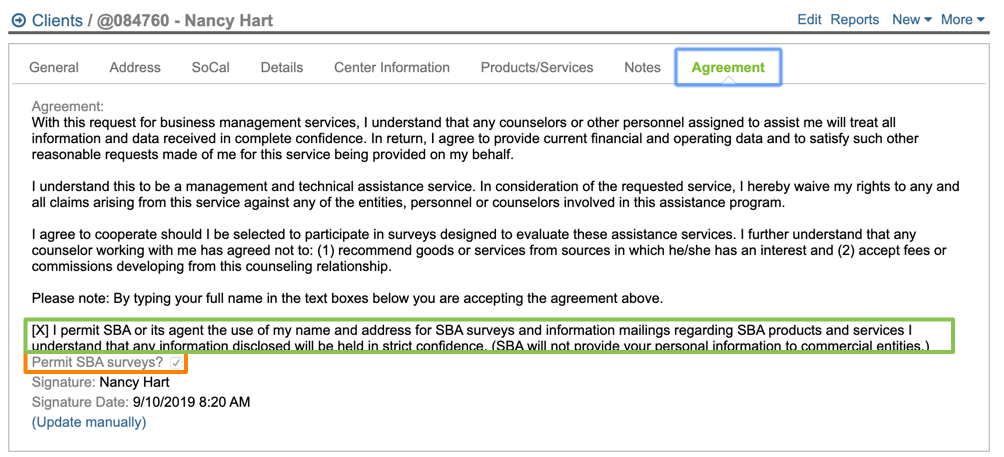 Using the "Update Manually" link the user can indicate the date of signature which is then additionally logged as a milestone and the client record is updated to reflect that a hard copy agreement is available on file. The "Update Manually" link does not affect the Permit SBA Surveys checkbox. If the client has agreed to Question 12, then you will still need to edit the client record to check the box accordingly.
