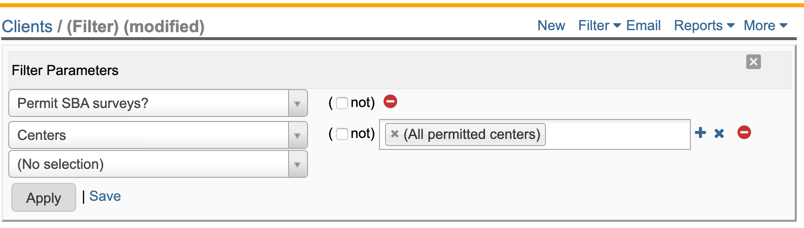 The "Permit SBA Surveys" checkbox on the Agreement tab of the client record is a searchable field, meaning you can run filters on this field. Go to View|Clients, click Filter|Create Filter and create the following filter to find all clients who have responded YES to Question 12: