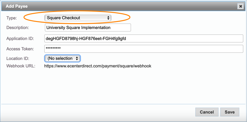 - At the "Add Payee" screen, select "Square Checkout " from the Type field.