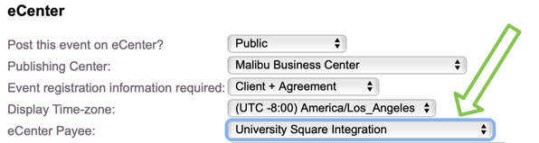 When you create an event in Neoserra and want to accept online payment for that event, you will need to indicate a payee. To do this, select the appropriate payment account from the Online Payment field found on the eCenter tab of a conference record, as shown in the next graphic: