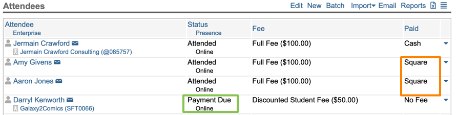 Once the event has been configured properly, it will be published on eCenter Direct. Clients can click the "Sign up" button on eCenter Direct to sign-up for the event. Registrants that do not pay as part of the initial sign-up process will be marked as have a "Payment Due". Registrants that pay online using Square will be marked accordingly: