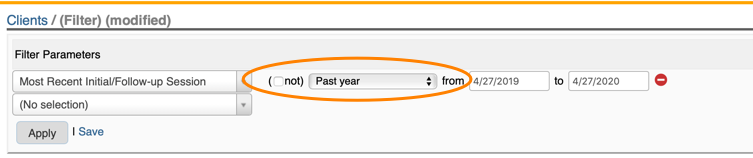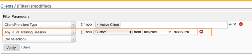 OutreachSystems strongly recommends that you create a filter and focus your correspondence to those clients who have had some interaction with your program in the last few months using the "Most Recent Initial/Follow-up Session" filter or the "Any I/F or Training Session" filter parameter: