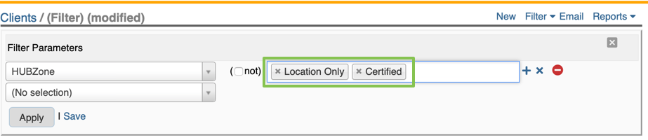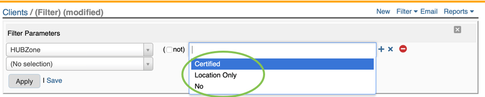Keep in mind, that if you want to find all clients located in a HUBZone, then you will want to filter both for those marked as "Located" and for those marked as "Certified":