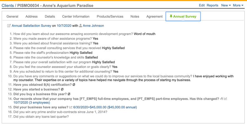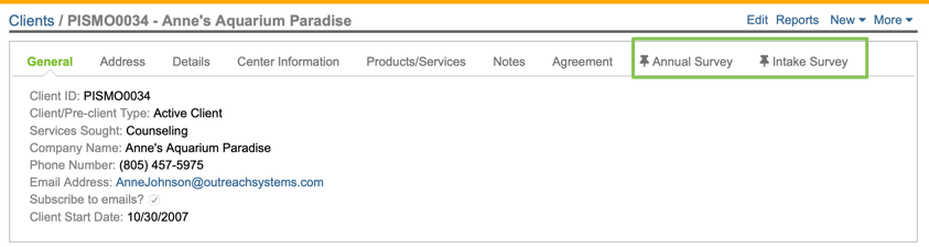 Administrators, in administrator-mode can choose which survey(s) they want to pin to the client's record. Keep in mind that when you pin a particular survey to a client's record, only the most recently completed response to that survey will be shown on the client form. In other words, if you use the same survey year after year, and you decide to pin the survey to the client record, then the last survey response provided by the client, will be displayed.