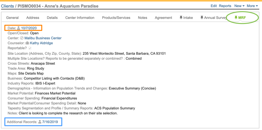 Clicking on the date (highlighted in orange) will take you directly to the actual custom form record. If there are multiple copies of this form completed for a client, then, at the bottom of the screen you will see: "Additional records" with a link to the other records (highlighted in blue).