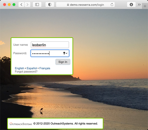 If the user does not receive the code, for whatever reason, then the only recourse is to contact their Neoserra database administrator who can verify the mobile phone number and/or email address on record. OutreachSystems, under no circumstances, can provide the user with access to their Neoserra database.