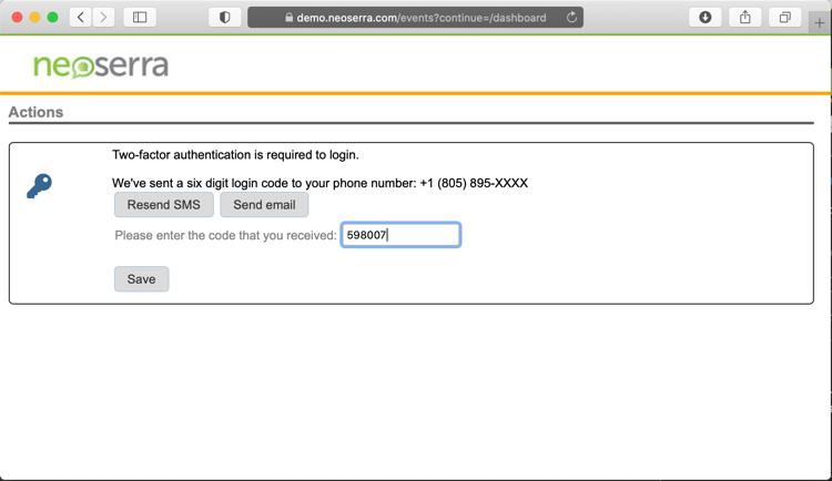 Assuming that the correct code has been entered, then, upon clicking "Save," the user will be logged into Neoserra.