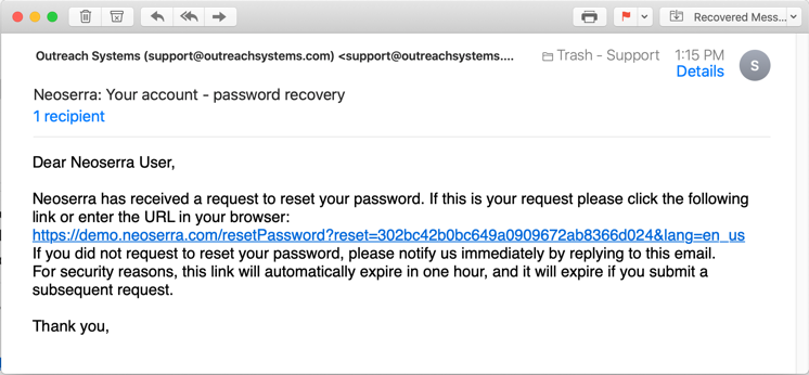 Next, they will be sent an email providing them with a link to reset their Neoserra password: