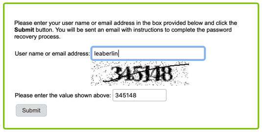Users can click on the "Forgot password?" link on the Neoserra login page if they have forgotten their password. They will need to enter their username or email address on file, enter the CAPTCHA shown on the screen and click "Submit:"