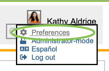 To access your personal preferences, hover over your name in the upper right hand corner of the Neoserra interface and click on "Preferences":