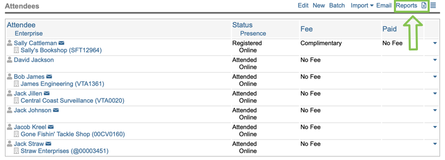 Simply click the Reports button located above the attendee list to generate your report: