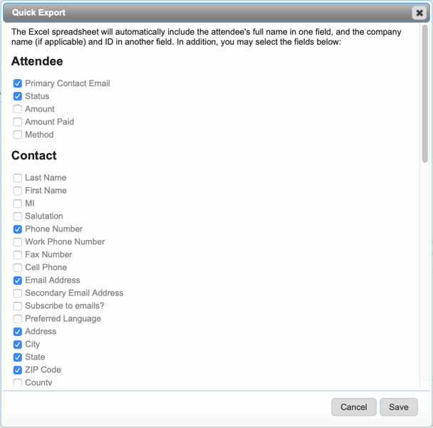 Clicking the Excel icon allows you to specify which contact and/or client fields you want included in your export: