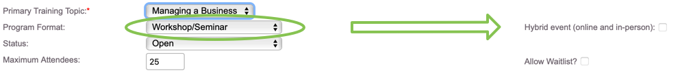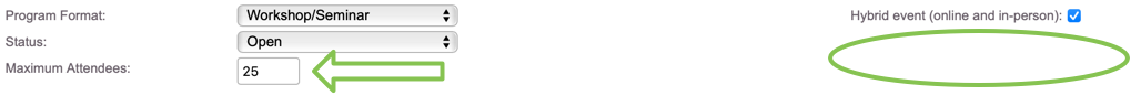 While the Hybrid checkbox appears when the Workshop option is selected, the Waitlist checkbox disppears when the Hybrid box is checked. In other words, Neoserra will not be able to maintain in-person and/or online waitlists. On the other hand, the Maximum Attendee count will be enforced for all in-person attendees only. In other words, in the example below, Neoserra will allow up to 25 in-person registrations but an unlimited number of additional online attendees and no waitlist will be maintained: