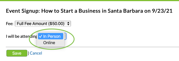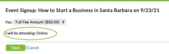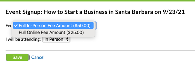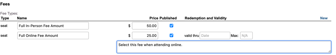 However, just because you gave a fee level a certain name this does not mean that eCenter Direct knows which fee goes with which attendance status. As such, a client could potentially select the online fee but choose to attend in-person. It will be up to you to verify that the client chooses the correct fee.