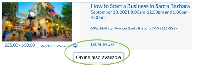 You will notice a few subtle changes on eCenter Direct when the hybrid event checkbox has been checked. On the listing of events you will see a new hover over icon letting the user know that the workshop is also available online: