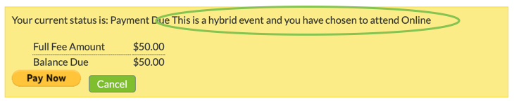 Regardless of which option they choose, the confirmation page will always let them know that this is a hybrid event and that they have chosen a specific option: