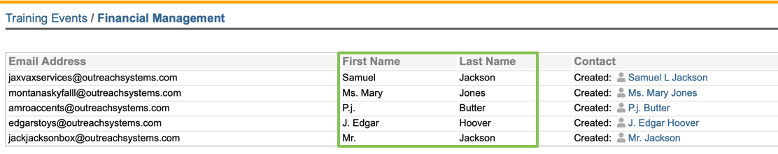 As noted above, the file must include a separate column for first name, and separate column for last name in addition to having a column for email addresses in order for the attendee information to be imported. Neoserra does offer a "Name (First Last)" import option where both the first and last names are included in the same column but importing combined names into separate fields is imperfect, at best. For example, what if the name field has "J. Edgar Hoover", or "Ms. Mary Jones" then Neoserra will make a best effort to separate the names into the correct first name and last name columns:
