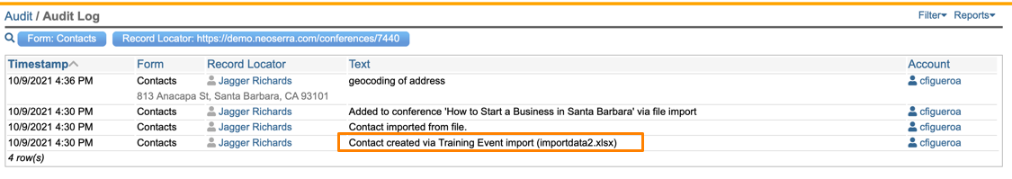 And the newly created contact records will show in their audit view that they were imported via the "Training Event Import" process by the user who initiated the process: