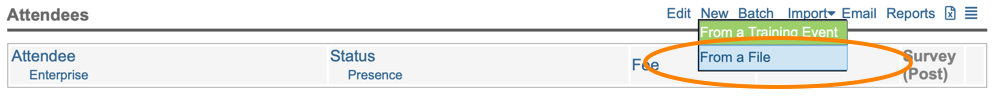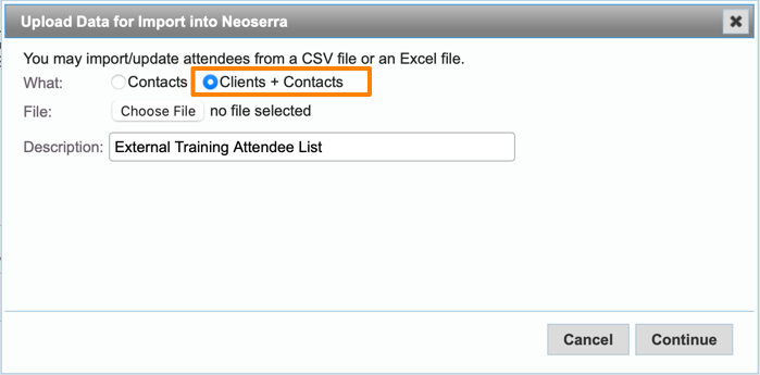 Note: The importing from file feature (whether importing contact or contact+clients) is ONLY available to those users with edit permissions to the training event records and add permissions to the contact records.