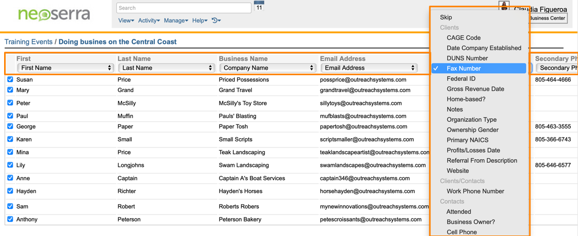 Neoserra and eCenter Direct work together to help advertise your events and capture online registrations. Using eCenter Direct you can ensure that you capture all the necessary demographic information from your attendees to meet your funding entities data requirements. However, OutreachSystems is aware that there may be times when a third-party event registration system is employed to capture online registrant information. Neoserra will allow you to import the attendees from a CSV or Excel file and add these attendees to a specific training event. If the attendees are not yet in the Neoserra database, then a new client record can be created using the information found in the file.