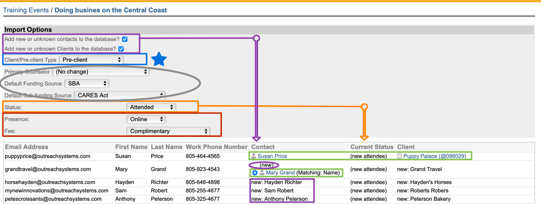 At the top of the screen, shown in orange in the screenshot above, you will be able to specify the information found in each column to be imported. Neoserra will make a best guess effort to identify each column, but it will be up to you to verify the information in each column. If a column is not to be imported then you may choose to "Skip" the information. Only the columns that match up to fields on the client or contact record may be imported, however, you may specify some data elements to be copied to the "Notes" field. Additionally, in the left hand column you may choose to check or uncheck the box indicating whether the client will or will not be imported into the attendee list of the event.
