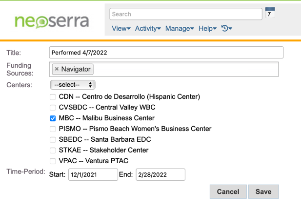 - By default, the Center(s) field displays the default center(s) selected on the Administration|Configuration|General Settings page. You can include/exclude centers as needed, but again, any changes made here probably also should be selected on the General Settings page.