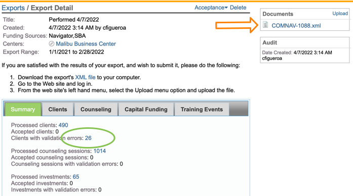 The COMNAVS export record provides a summary of the data to be exported and it will also identify any validation errors that Neoserra has encountered in your data. Since the COMNAVS system will reject all records if even one tiny error is found, the records with validation errors are excluded from your export. If you have validation errors, as show in the green circle above, then it is recommended that you resolve these errors first; once you have cycled through your errors then delete the incomplete export; and then create a brand new export to be uploaded to COMNAVS that includes all your activity.