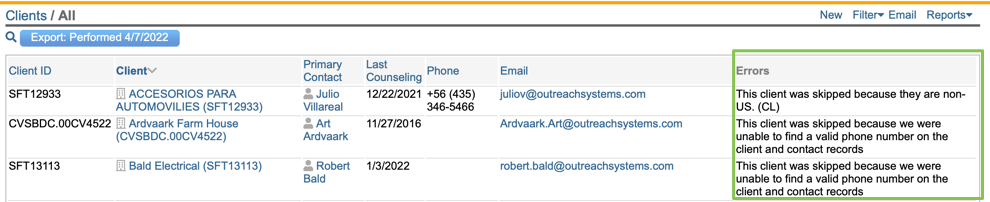 You can click on "Clients with validation errors" link to see which clients are being excluded from the export and the reason why: