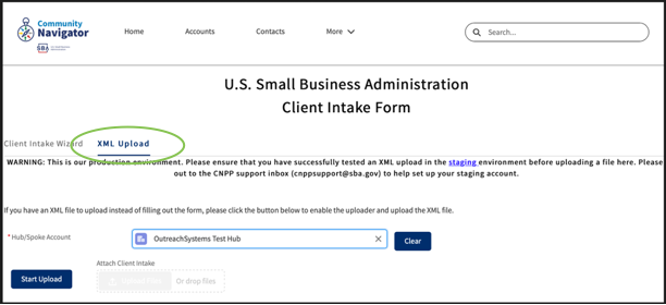 Select "XML Upload" and choose your "Hub/Spoke Account" as assigned to you by SBA, next click "Start Upload" and then click "Upload Files" to select your XML file: