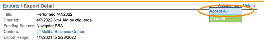- On the export record that you succcessfully uploaded, select Acceptance|Accept All:
