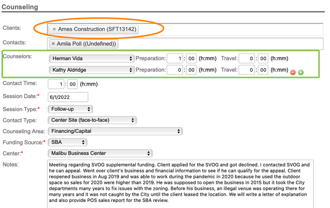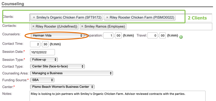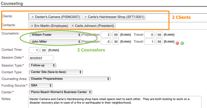 - Multiple Clients, One Counselor In this scenario, it is assumed that the two clients are meeting on a common issue together (such as potential joint venture, for example) with the same counselor. Again, it is assumed that everyone was in the room at the same time, if the clients came in at separate times, then the sessions should be entered separately:
