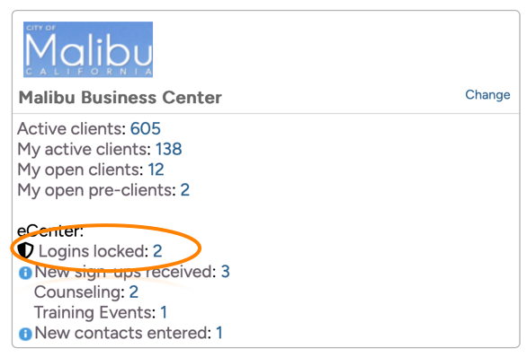 Clients that need to log in to eCenter Direct will need to provide the email address that is also found in their corresponding Neoserra contact record, along with their password. As per the FAQ the client's password is encrypted and will not be visible to you. If the client does not remember their password, then the best option is for them to click on the Forgot Password link on eCenter Direct. Clients that do not remember their password and try to log in using an incorrect password more than 5 times will be locked out for security reasons. You will know who locked themselves out by looking at your center panel on the home page of Neoserra: